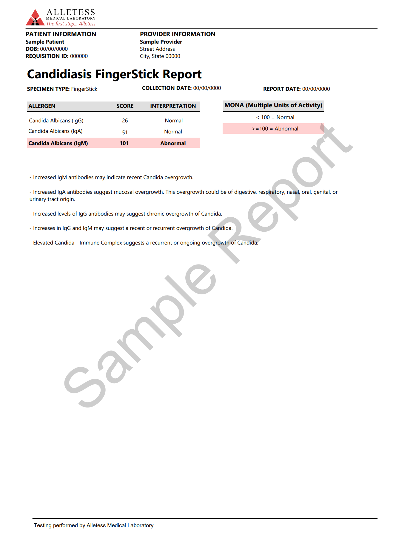 Symptoms alone are not enough to confirm Candida overgrowth. Because its effects mimic many other conditions, laboratory testing adds an objective measure of immune response. By assessing IgA, IgG, and IgM antibodies, this test captures both short-term and long-term immune engagement, creating a more complete picture of how the body is reacting to Candida albicans.