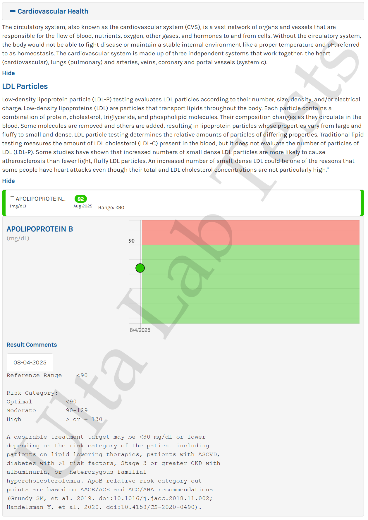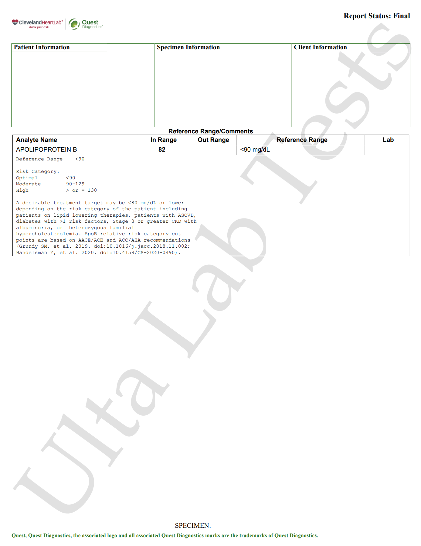 Monitoring Treatment Progress: Individuals undergoing treatment for high cholesterol or other lipid disorders may have their apoB levels monitored over time to assess the effectiveness of therapy and guide treatment modifications.